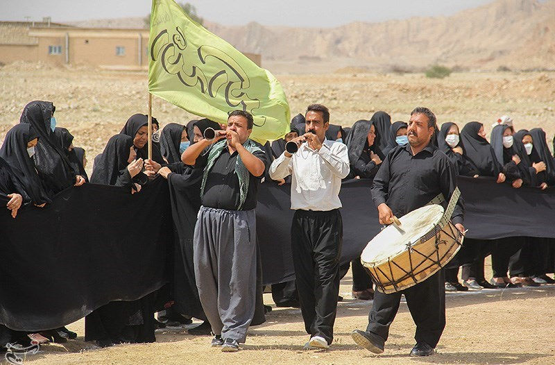 سازهای اصلی، دهل (نماد ضربآهنگ زمین) و سرنا (نماد فریاد آسمان) هستند؛ ریتم دهل سنگین، با وقار و تکرارشونده است و ملودیهای نافذِ سرنا، اتمسفری حماسی و در عین حال بهتآور و رستاخیزی (سور اسرافیل) ایجاد میکنند. این اجرا غالباً در «چمرگاه» (فضای باز) طنینانداز میشود تا اندوه، در پهنه و پیوند با طبیعت، معنای اساطیریاش را بازنمایی کند.